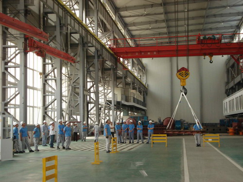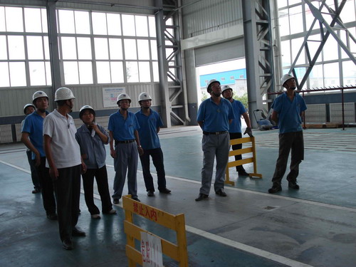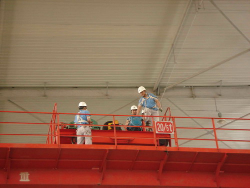 此次預(yù)演活動的主要內(nèi)容是,吊車在運行過程中突然停電后工作人員的應(yīng)變能力。演習(xí)開始了,首先,停電后吊車工先把開關(guān)手柄放置到“零位”并監(jiān)控總電源。同時,生產(chǎn)部裝配班、物流班部分員工在各自科長的帶領(lǐng)下在吊運物件下設(shè)護(hù)欄并監(jiān)護(hù),以防有人誤進(jìn)危險區(qū)域。其次,生產(chǎn)技術(shù)部維修人員按照安全操作規(guī)程,爬上吊車走臺,盤車移動到合適位置然后慢慢拉、合抱閘把物件送回地面。最后,解除危險。