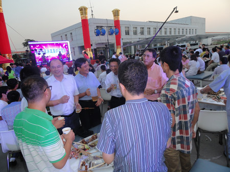 下午5點(diǎn),在夕陽的映照中,公司辦公樓前,忙碌的員工穿梭在會(huì)場,辦公樓南面已搭建好舞臺(tái),碩大的LED屏矗立在舞臺(tái)上。舞臺(tái)兩側(cè)各豎立著兩個(gè)團(tuán)結(jié)柱。舞臺(tái)前的空地上,已擺放好63張桌子,每張桌子配放6把椅子。桌子上,豐盛的飯菜已放好,靠西邊的草坪旁,是備好的新鮮的青島扎啤。